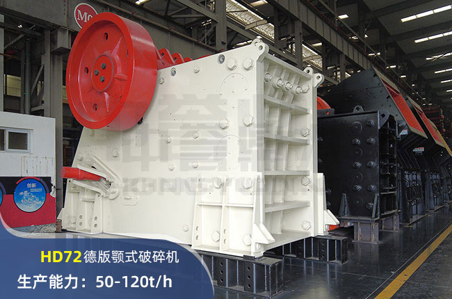 HD72(57)顎式破碎機進料口尺寸460×720mm,進料粒度425mm,出料大小45-100mm,電機功率6p 55kw,時產可達120噸。