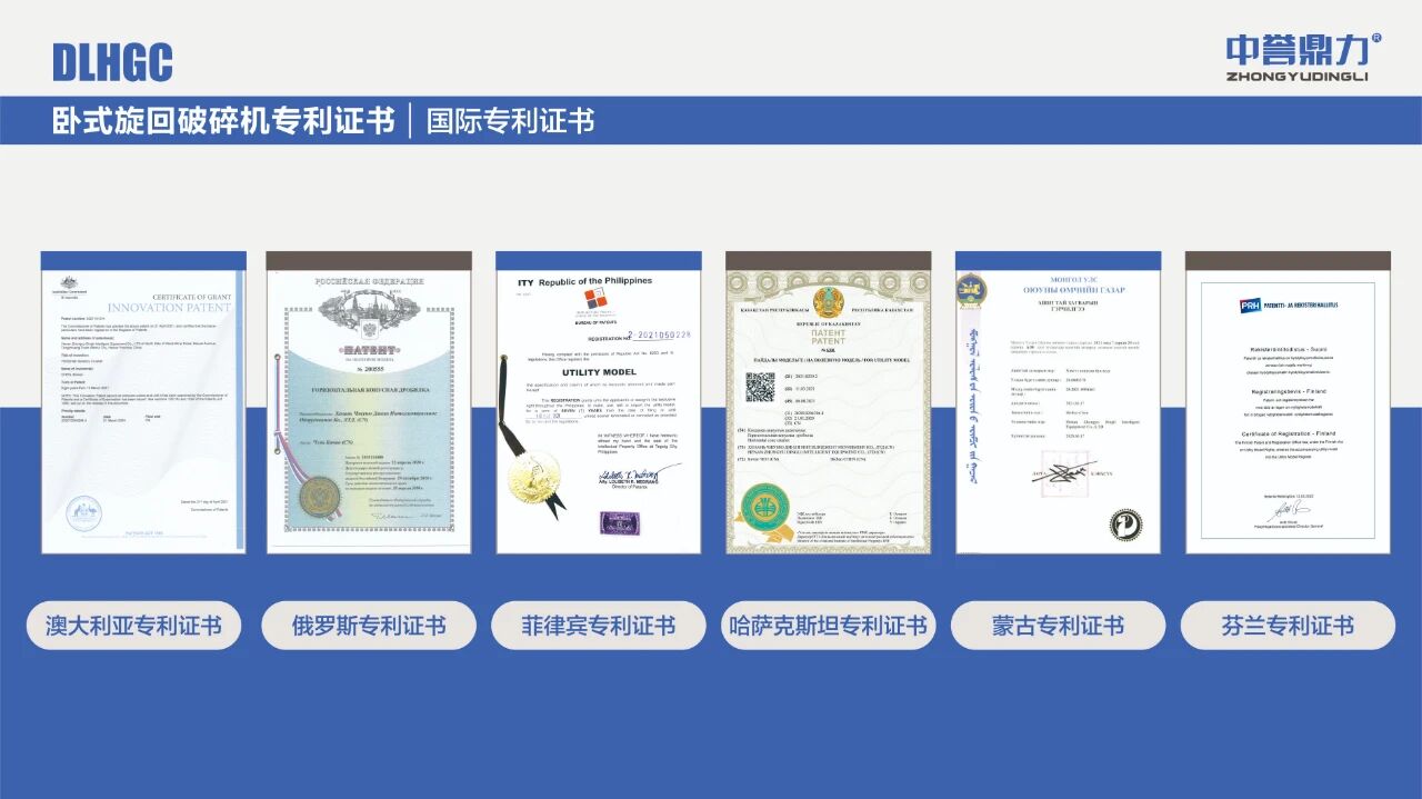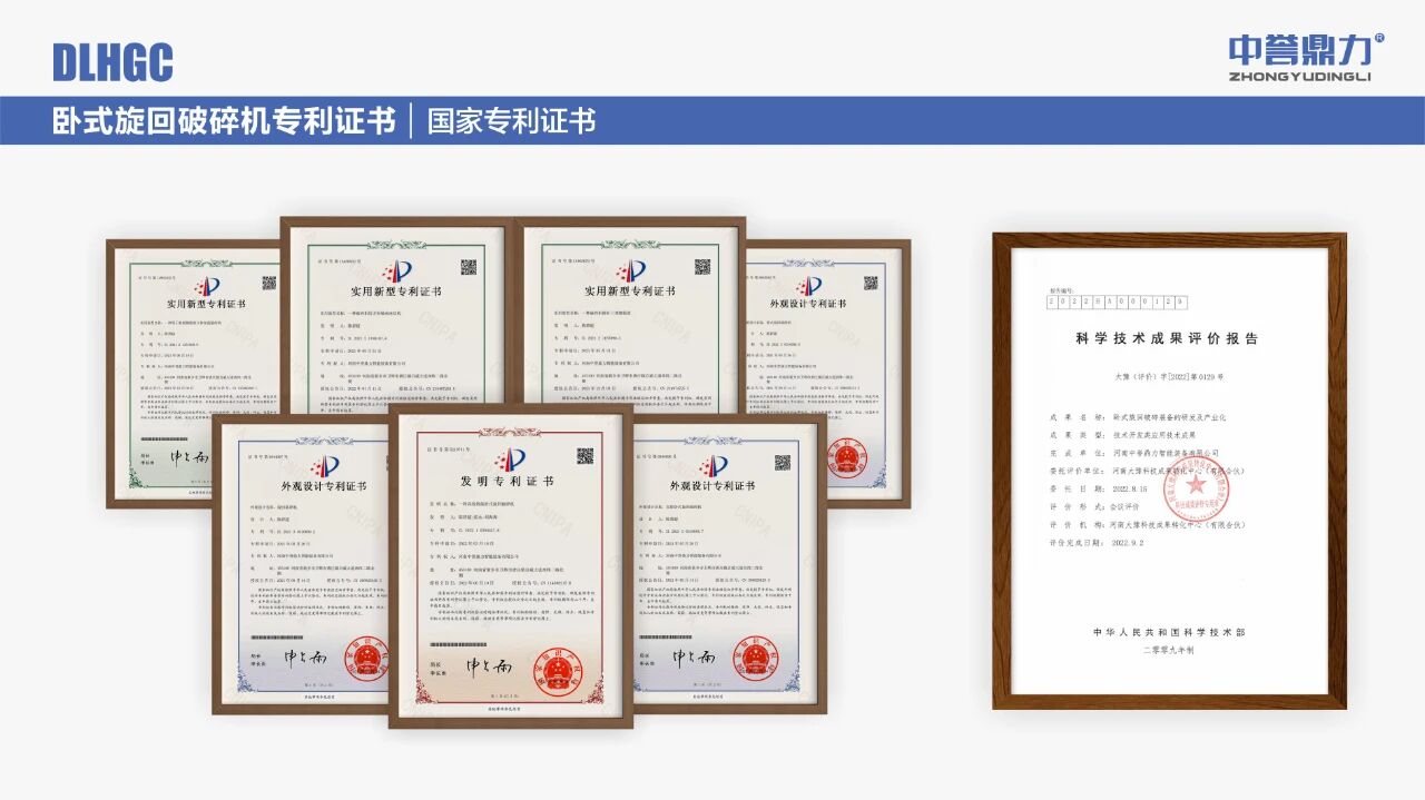 中譽鼎力臥式旋回破碎機不僅先后獲得1項科學技術成果、多項國家專利【[發明專利(ZL 2022 1 0254447.6)] 一種高效智能臥式旋回破碎機;[外觀專利(ZL 2021 3 0316696.X)] 臥式旋回破碎機;[外觀專利(ZL 2021 3 0316696.X)] 雙腔臥式旋回破碎機;[實用新型(ZL 2021 2 1351908.8)] 一種用于機架側板的立體加強筋結構;[實用新型(ZL 2021 2 1187890.3)] 一種破碎機排礦口調整裝置;[實用專利(ZL 2021 2 1188187.4)]一種破碎機用方形軸承座結構】和6項國際專利(查看國際專利)。